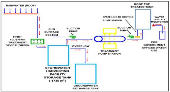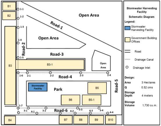 The stormwater water intervention facility has a total catchment area of 3 hectares with a storage capacity 1750 cubic meter. Figure 5 shows the schematic diagram of the proposed stormwater infrastructure system with the different components (i.e. Flushing treatment device, storage tank, groundwater recharge tank, UV treatment , suction pumps , elevated tank, water quality monitoring system and valves and pipings).The recommendation to consider runoff water from the surface/roads aside from rainwater/stormwater falling from the roof is not feasible because the design storage capacity of the stormwater is limited only to one (1) hour rainfall duration which is enough to fill the storage tank. On the other hand, elevating the water storage tank in the proposed design and system is very much appreciated. However, the said recommendation is not feasible considering that the building structures in the proposed site were not uniform in terms of number of storey (I.e. BJMP and PNP buildings are 4 storey buildings while others are two storey and one storey buildings). Elevating the storage tank with this physical condition still needs motor pumps and also requires heavy foundation structures. In addition, the space of the proposed site had limited space. Hence, the space occupied by the proposed subsurface storage tank when covered will be useful for other purposes. Nevertheless, the recommendations will still be considered as a possible option when scaled up to other areas.